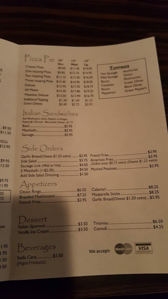 Guests can enjoy a variety of pizzas, from a simple one-topping pie to options featuring savory meats and fresh vegetables. Beyond pizza, the menu includes traditional pasta like tagliatelle, lasagna, and spaghetti served with meatballs or rich meat sauce, ideal for a satisfying meal in a relaxed, unpretentious setting. Complement your plate with popular appetizers such as crispy onion rings or mozzarella sticks, and side orders like garlic bread or a fresh side salad.